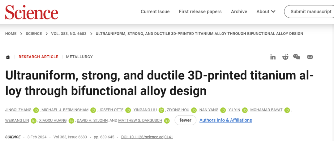 2024年2月8日,重庆大学材料科学与工程学院与澳大利亚昆士兰大学、丹麦技术大学的联合科研团队在Science发表了题为Ultra-uniform, strong, and ductile 3D printed titanium alloy through bifunctional alloy design文章,提出一种“一箭双雕”的合金设计策略,为探索多种金属粉末原料、可变的打印合金体系、不同的3D打印技术以及先进的多材料打印开辟了一条途径。