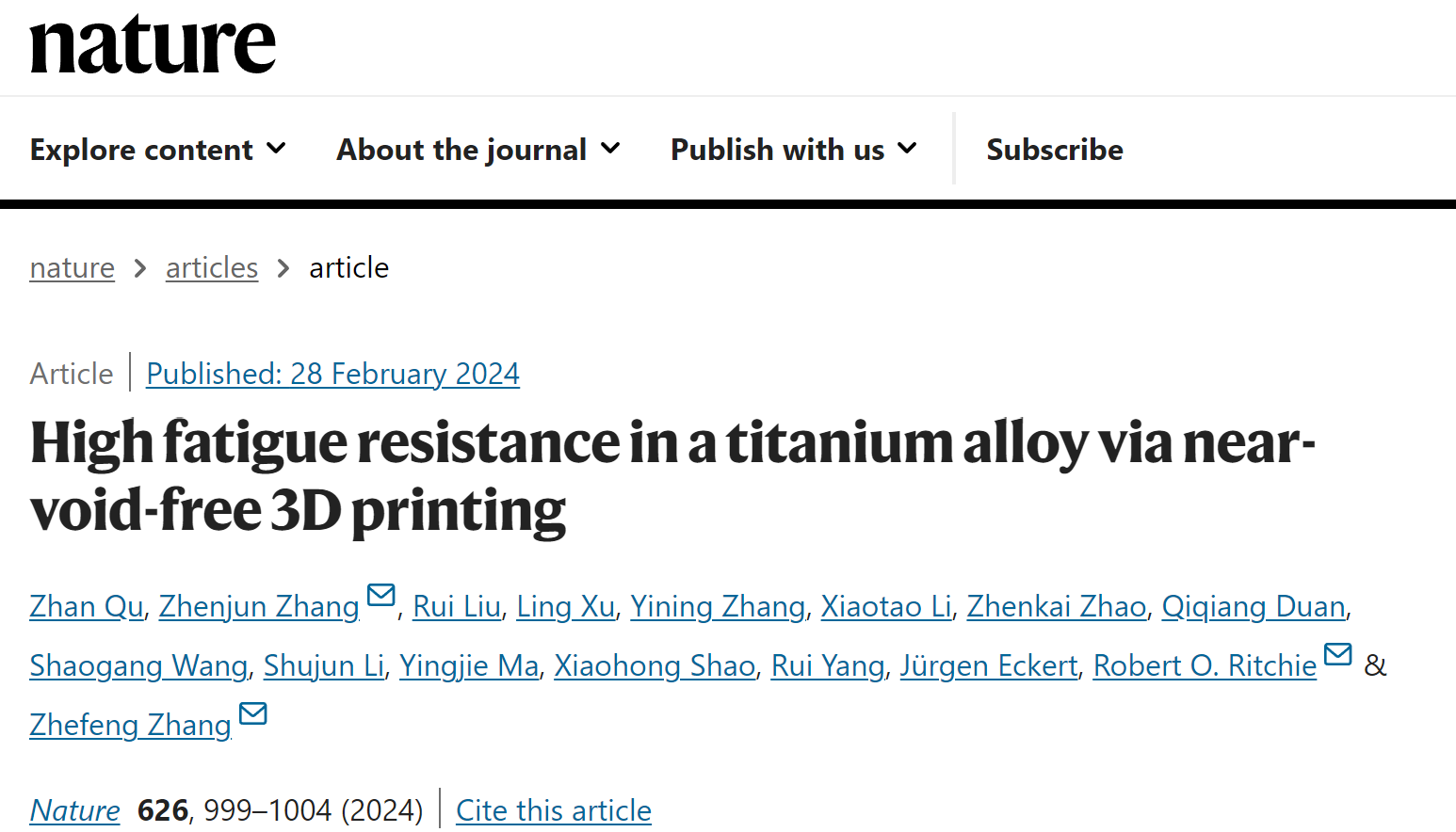 4、Nature:3D打印抗疲劳钛合金取得突破性进展