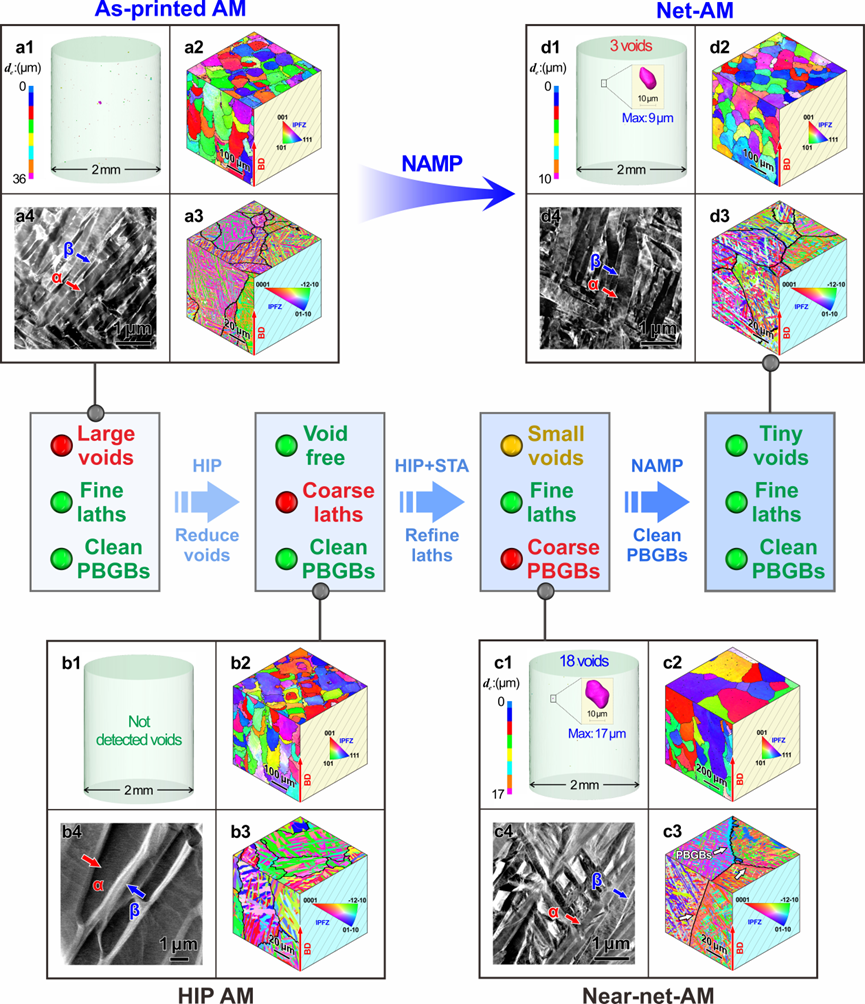 幸运的是,研究人员在Ti-6Al-4V合金中首次发现,高温下3D打印态组织的晶界迁移及气孔长大与相转变过程表现出异步的特性,即存在一个热处理工艺窗口,既可实现板条组织细化,又能有效抑制晶界α相富集及气孔复现。为此,研究人员巧妙地利用了这一工艺窗口,发明了缺陷与组织分步调控的NAMP新工艺(Net-Additive