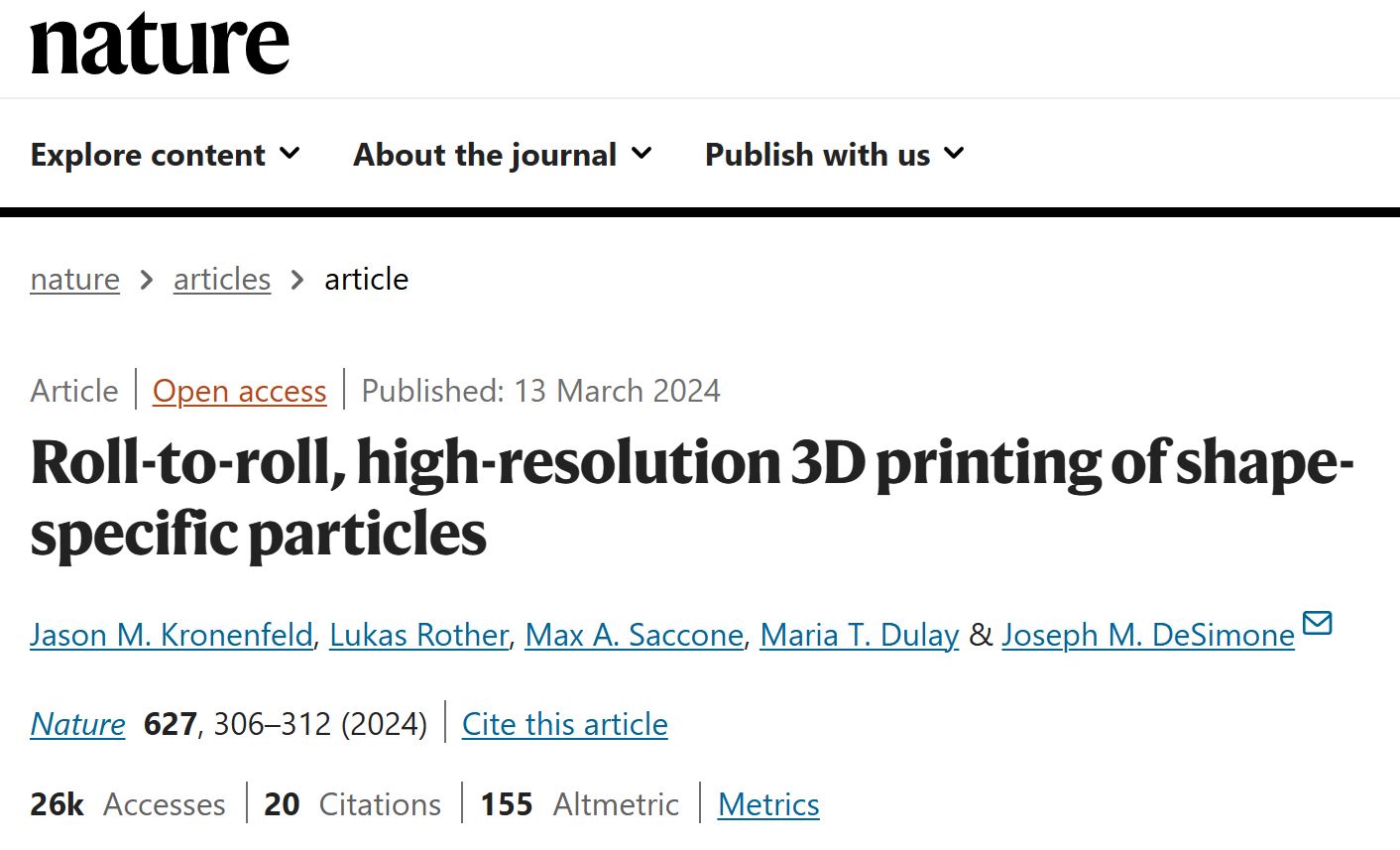2024年3月13日,来自美国斯坦福大学的Joseph M. DeSimone等研究者介绍了一种可扩展的且高分辨率的3D打印技术,用于基于卷对卷连续液界面生产(r2rCLIP)的形状特定颗粒的制造。相关论文以题为Roll-to-roll, high-resolution 3D printing of shape-specific particles于2024年03月13日发表在Nature上。