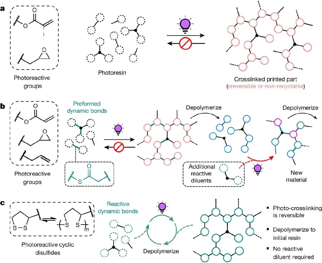 该树脂系统不仅表现出良好的环境稳定性,而且其合成过程也考虑到了绿色化学原则,采用更安全、毒性较低的试剂和溶剂。这种新材料使得3D打印件可以在光照下发生可逆的聚合反应,为未来的回收再利用提供了可能性,并且减少了对环境的影响。此外,技术还展示了优异的打印精度和机械性能,有望推动3D打印行业的进一步发展。