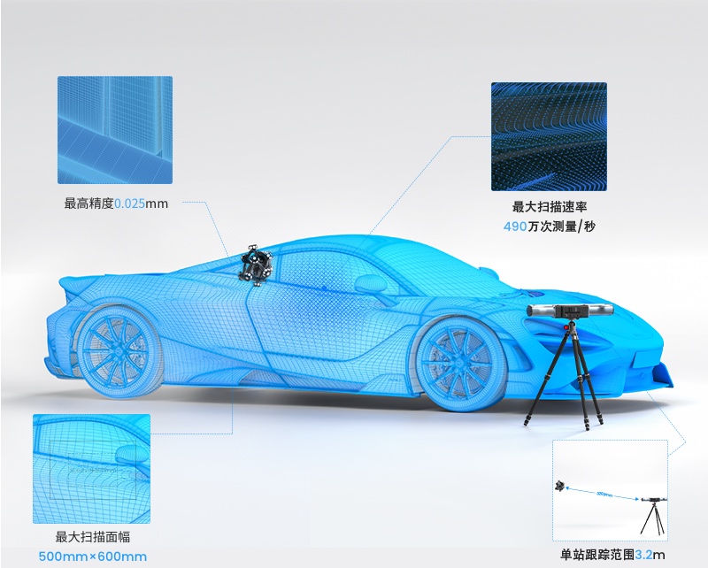 无线、轻量化的设计也大大提高了手持扫描仪进行大范围扫描的易用性,便于灵活驾驭大型工件及复杂测量场景。同时在新一代高性能边缘计算模组加持下,运算效率一举跃升至全新高度,配合每秒高达490万次测量速率,可实现行云流水般的流畅扫描体验,复杂场景测量更高效、更便捷。