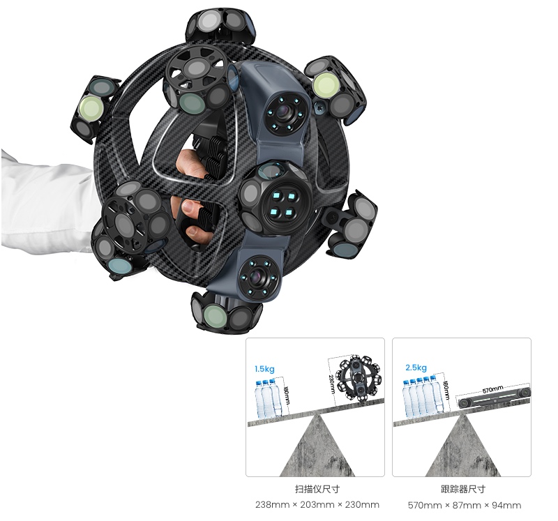 跟踪器尺寸为570mmx87mmx94mm,仅2.2kg,能够灵活放置于各种复杂场景,实现轻装上阵的高效作业,彰显科技感与便捷性的完美融合。