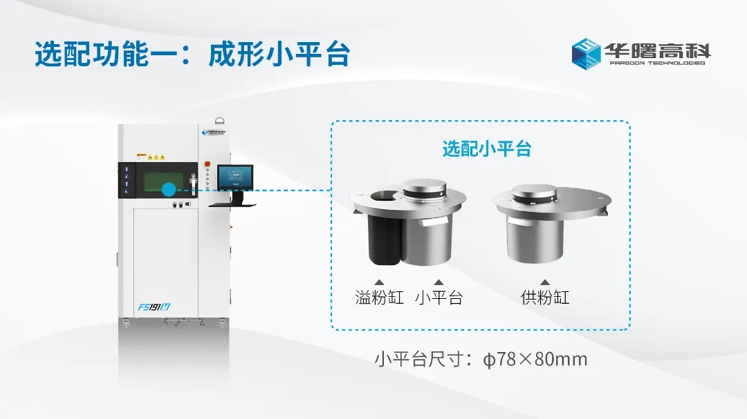 用户可选配尺寸为φ78mm×80mm成形小平台,测试和开发新合金配方或探索加工昂贵稀有的材料工艺,可帮助用户节约粉末使用量,有效降低开发和工艺验证成本。