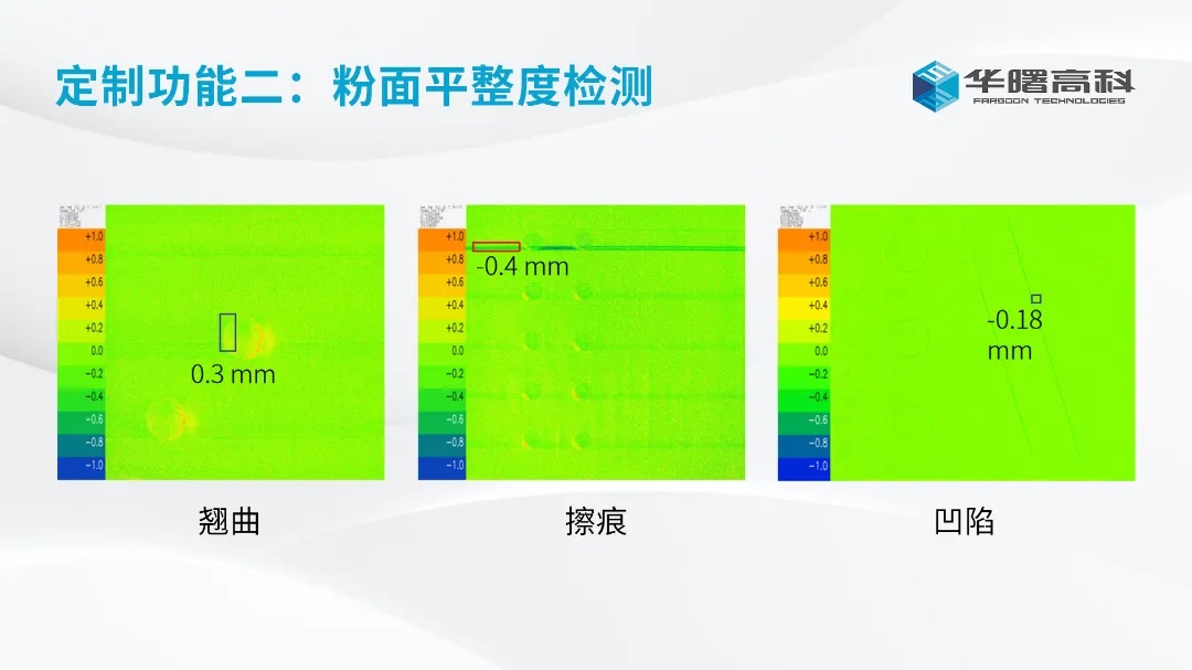 FS191M设备可定制采用华曙高科新专利——粉面平整度检测技术,该技术是一种利用主动式光学测量进行三维重建的技术,采用2D与3D检测结合,其检测Z轴精度为±20μm,对翘曲、擦痕等铺粉缺陷检测成功率高,可有效助力打印策略优化、铺粉设备评估优化,以达到更精准的铺粉质量检测,从而提升材料研发效率。