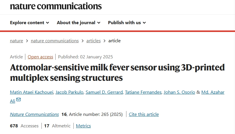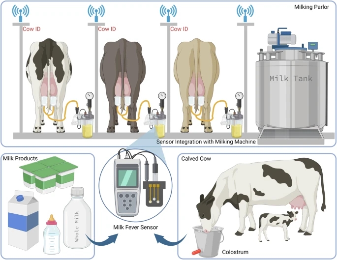 2025年1月8日,弗吉尼亚理工大学的研究团队最近开发了一种创新的3D打印传感器技术,有望改变奶牛产乳热的诊断方法。产乳热是奶牛养殖业中普遍存在的健康问题,对奶牛的健康及农场的经济收益造成严重影响。该疾病不仅影响奶牛的生理功能,还会导致牛奶产量下降,给奶牛场带来显著的经济损失。