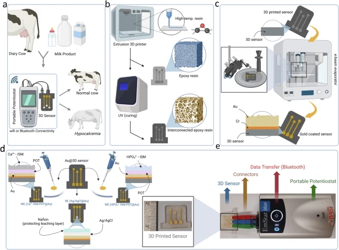 传感器的核心功能是测量牛奶样本中钙和磷酸盐的浓度。它采用聚合物树脂3D打印技术制造,使得研究人员能够以低成本和高灵活性生产这种传感器。生产过程包括逐层打印和紫外线固化以形成微观表面结构,并使用电子束蒸发镀金。微观波纹表面具有高灵敏度,传感器结构总共包含三个电极,其中两个用作工作电极。
