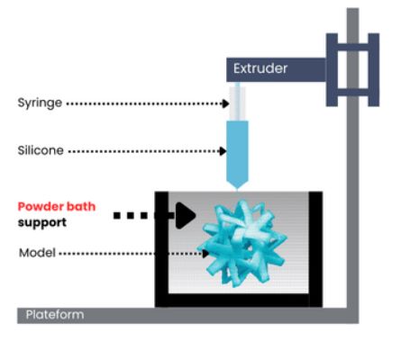 Dynamics独创的一种创新工艺,它革新了传统的材料挤出(MEX)方式,通过引入自动化的材料沉积机制来构建复杂结构。这项技术利用颗粒介质作为支撑系统,取代了传统上需要构建的支撑结构,使得生产不受重力影响的高度复杂部件成为可能。例如,可以高精度地创建解剖模型或器官复制品,大幅节省时间和资源。