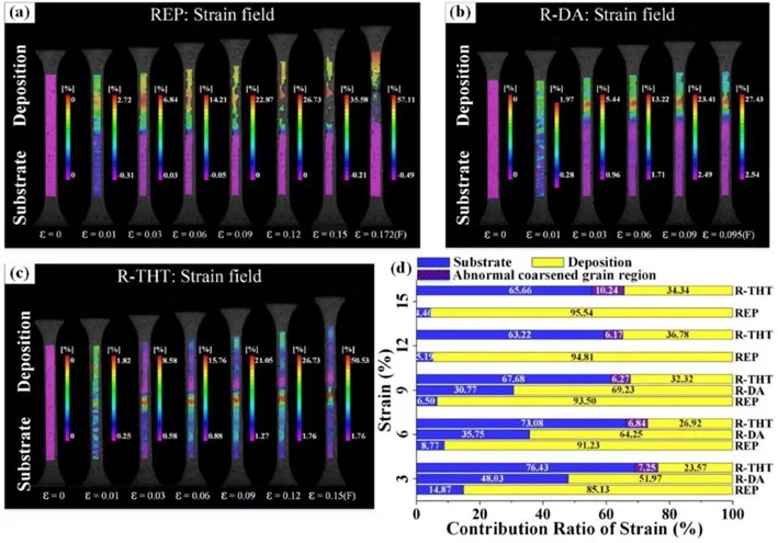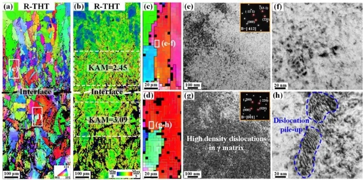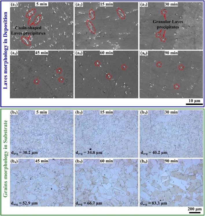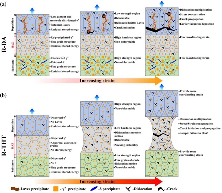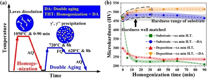 西安交通大学卢秉恒院士团队黄科教授等人提出一种低温短时长均匀化接续时效的新型热处理制度用以调控增材修复Inconel718高温合金的组织性能。研究发现低温短时长均匀化处理可在有效溶解修复区内残留链状Laves相的同时规避锻造基底等轴细晶的严重粗化,接续的时效处理则进一步实现了γ"相的全域析出。得益于硬脆共晶相的溶解与强化相的弥散析出,新制度处理后修复合金实现了相结构的跨区域均匀分布并改善了修复区、基底和热影响区间的应变协调能力。新制度处理后增材修复合金的优异强塑性将显著提高构件在极端载荷条件下的服役安全并延长构件的剩余寿命。相关研究成果以“Enhanced