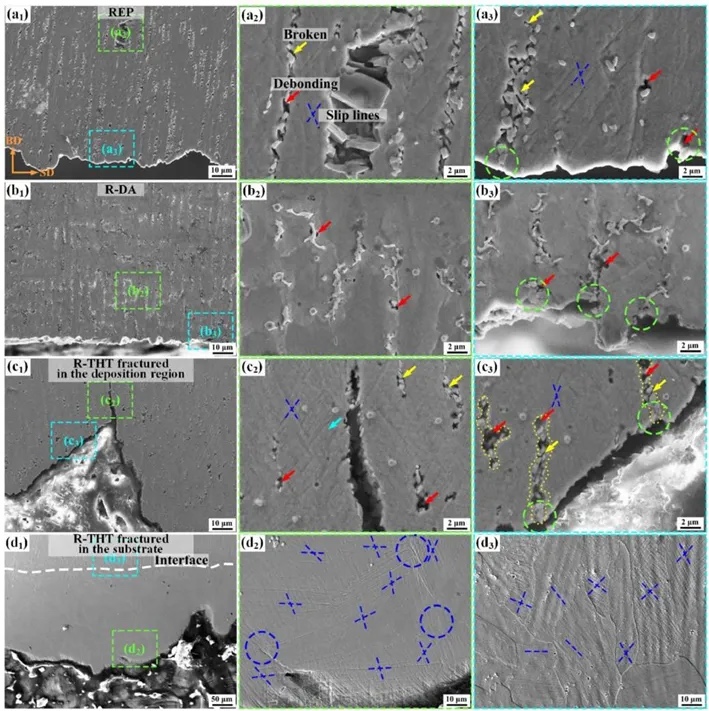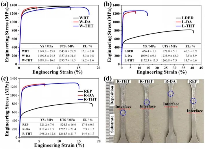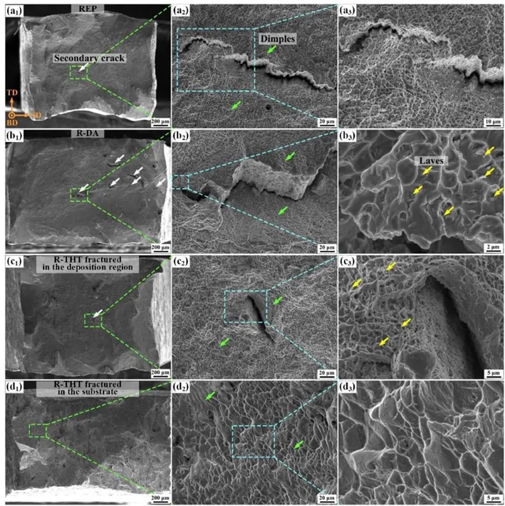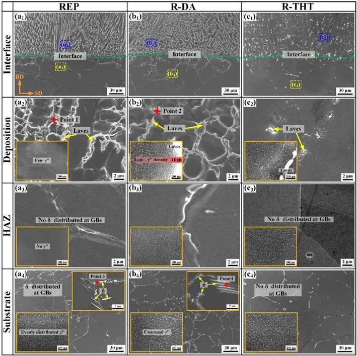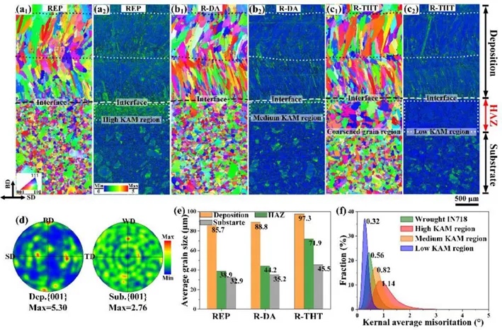 718高温合金强度有余但塑性欠佳的行业难题,本文首次提出了一种低温短时长均匀化接续时效的新型热处理制度,系统研究了新型与传统热处理后激光定向能量沉积修复Inconel718高温合金的组织与性能。结合OM/FE-SEM/EBSD/TEM等表征技术,对比分析了修复区/热影响区/基底跨区域不均匀晶粒结构与相结构的演变机理。结果表明,新制度处理后修复区内Laves相的溶解极大规避了合金提前失效的风险,同时跨区域弥散、均匀分布的γ"相既充分保障了析出强化效应又改善了跨区域的应变协调能力。对比直接时效处理的修复合金,新制度处理后的修复合金在强度不变的前提下延展率提升了仅1倍,综合性能也超过了锻造合金标准。未来团队拟对增材修复Inconel718高温合金的疲劳、冲击等关键服役性能开展深度测试评估,推广相关增材制造技术与后热处理制度在高附加值损伤件修复中的实际应用。