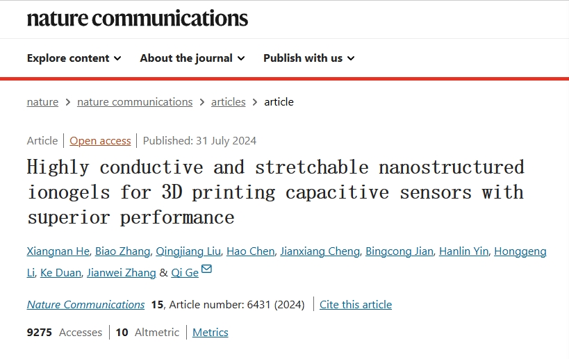 2025年1月12日,南方科技大学机械与能源工程系葛奇教授领导的科研团队成功研发出一种具有双连续纳米结构的紫外固化离子凝胶,可在不牺牲3D打印性和机械性能的情况下实现高导电性。这一突破性的研究成果已发表于国际知名期刊《自然通讯》。