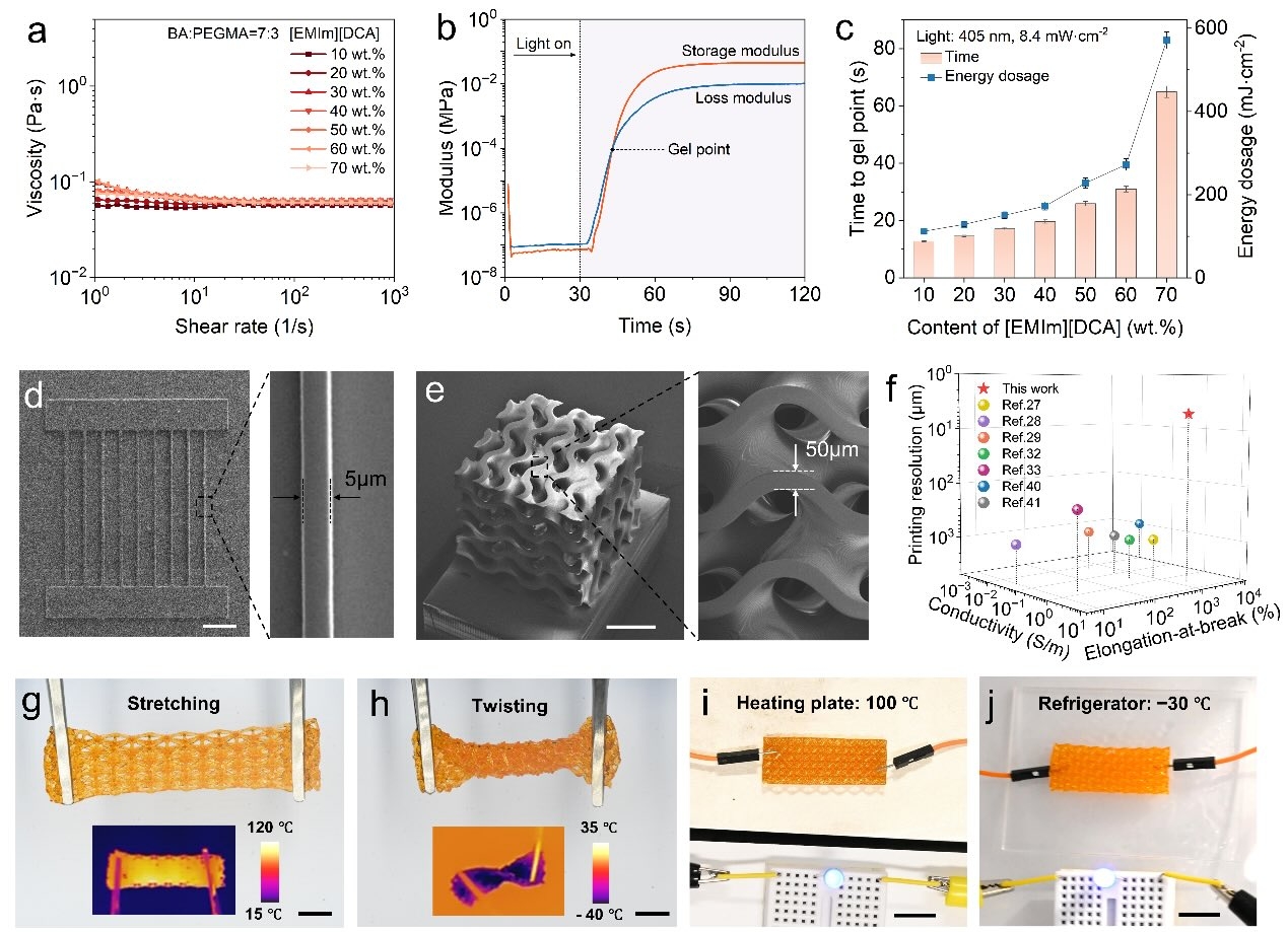 3D打印,能够以高分辨率打印出高度复杂的几何形状。此外,含有离子凝胶的3D打印结构在宽温度范围内表现出卓越的变形能力和导电性。如下图g和h所示,3D打印的八重桁架结构在100℃和-30℃的极端温度条件下,均展现出了显著的可变形性。同时,八重桁架结构的导电性在这些温度条件下依然保持稳定。