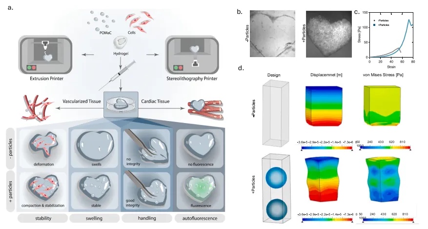 研究人员在各种水凝胶中嵌入POMaC颗粒(特别是纤维蛋白、GelMA和海藻酸盐)创造了多功能的颗粒生物墨水,这些墨水支持基质细胞、成纤维细胞和人类诱导多能干细胞衍生的心肌细胞的重塑和组织生成,并增强血管形成,同时添加荧光以用于构建标记(图1a和b)。微机械压缩测试结果表明,复合材料在大范围应变下表现出与其母本水凝胶相似的行为(图1b),这有助于挤出式3D打印。剪切压缩测试显示,在低应变下,变形主要通过水凝胶组分传递,复合颗粒生物墨水表现出与其母本水凝胶几乎相同的机械性能(图1c)。然而,随着压缩剪切应变增加,变形通过水凝胶传递,使弹性颗粒相互接触,从而抵抗施加的变形(图1c)。因此,复合生物墨水在较高应变下表现得像弹性固体,最终表现出比其母本水凝胶显著更高的极限抗拉强度(图1c)。有限元建模表明,当结构受到相同的压缩位移时,与仅有的水凝胶相比,复合材料内的von