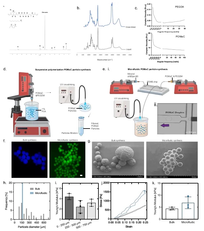 本文提出了一种方法,该方法结合了生物水凝胶和弹性聚合物的优点,形成了一种适用于立体光刻和挤出3D打印的复合颗粒生物墨水(图1)。通过将弹性微粒整合到生物源性水凝胶中,本文设计了一种生物墨水,该墨水在自然水凝胶的支持下保持了细胞面对的生物学特性,并且在高应变下具有类似于聚合物弹性体的机械性能(图1a)。这些弹性微粒是通过从柠檬酸、马来酸酐和1,8-辛二醇通过缩聚反应合成的一种可紫外交联的弹性体POMaC,以批量和滴状微流控方法生成的。这种与细胞兼容的弹性体之前已被用作心脏组织工程中的支架,支持细胞生长,并且允许创建体外器官芯片模型以及体内植入的压力传感器。此外,POMaC还被用来生产AngioChip,这是一个促进体外血管化的平台。