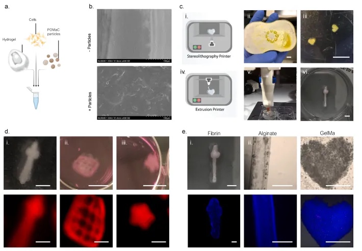 为扩大富含POMaC颗粒的生物墨水的应用范围,本文探索了它与不同3D打印模式的兼容性。具体来说,本文进行了立体光刻生物打印的试验,这种方法以其高分辨率和精确度而闻名(图3ci-iii)。此外,本文还研究了挤出打印,这种方法具有多功能性和可扩展性,并且在材料多样性方面也表现出色(图3civ-vi)。本文的结果表明,这种混合生物墨水促进了复杂结构的制造,同时赋予结构自荧光特性,可以在打印后用于成像和跟踪(图3d)。此外,本文还成功地展示了生物墨水与一系列水凝胶的打印能力,包括纤维蛋白、藻酸盐和GelMA(图3e)。