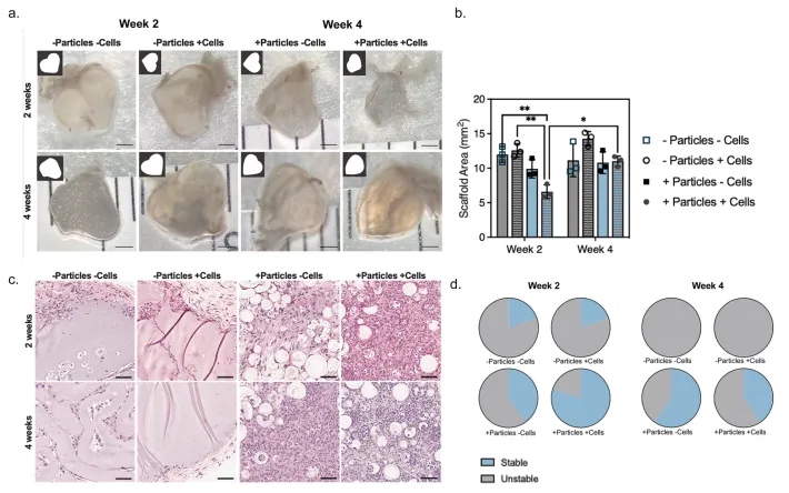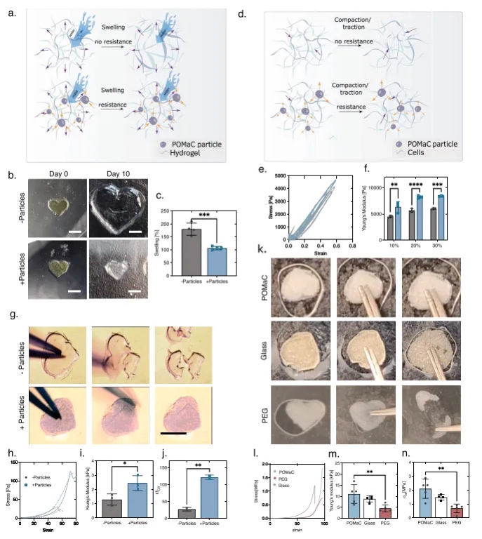 本文将POMaC颗粒加入PEGDA水凝胶中,与仅由PEGDA组成的对照组相比,观察到的膨胀程度有所减少。本文假设这种减少是由于嵌入在水凝胶基质中的颗粒所赋予的阻力(图4a–c)。使用微机械测试仪测量杨氏模量显示,含有颗粒的混合3D打印海藻酸盐构建物的弹性显著高于仅含海藻酸盐的对照组(图4d–f)。组织工程构建物必须在细胞培养和体内植入所需的操作步骤中保持其形状并保持完整,以最终保留其在体内的功能。本文的实验表明,将颗粒加入GelMA后进行3D打印,结果得到的构建物较不易破碎(图4g)。压缩测试(图4h)证实了这一改进,含有POMaC颗粒的构建物表现出显著更高的杨氏模量(图4i)和更大的极限抗压强度(图4j)。