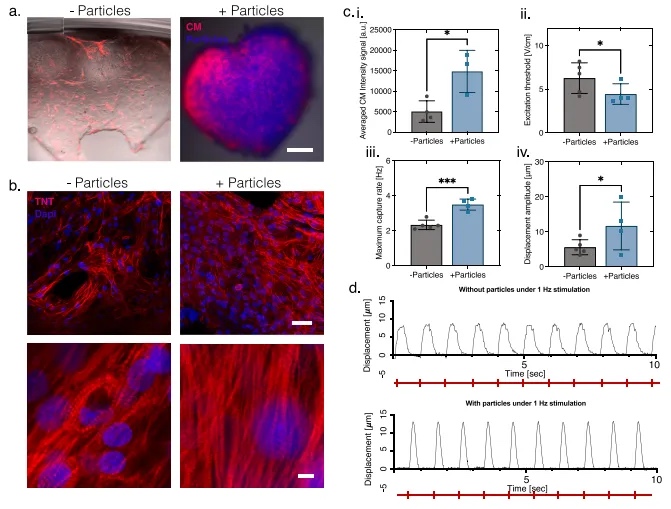 3D打印的结构上,并监测它们的发展。这些细胞培养了10天,在此期间它们被允许扩展并表现出收缩活动(图5a)。肌钙蛋白-T(TnT)染色表明心脏组织形成更加健壮,这通过图像分析工具进一步量化(图5b和ci)。心脏功能也得到了评估,结果显示含有颗粒的结构有所改善,表现为较低的兴奋阈值(图5cii)和增加的最大捕获率(图5ciii)。此外,在1Hz刺激下,含POMaC颗粒的结构位移幅度更大(图5civ和d)