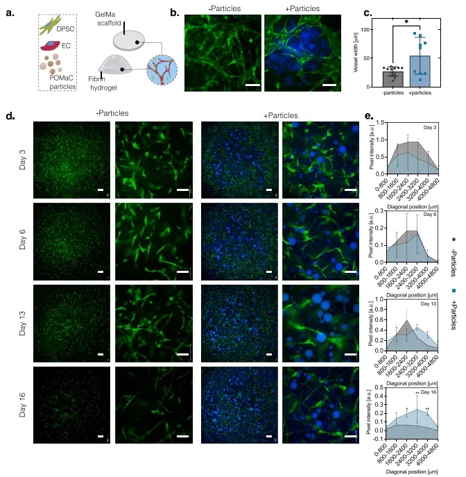 血管形成是组织工程策略成功的关键。为此,本文将内皮细胞和支持细胞(牙髓干细胞DPSC)一起播种到两种不同的基质中,这两种基质都加入了弹性POMaC颗粒:GelMA和纤维蛋白(图6a)。在GelMA/POMaC颗粒构建物中的血管形成得到了增强,血管直径显著更宽(图6b和c)。