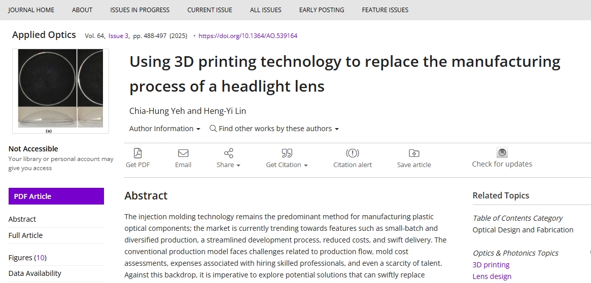 叶家宏指出:“而且,随着产品设计日益复杂化,模具设计和制造工艺也变得更加复杂,这进一步降低了生产速度。为了在快速变化的市场中保持竞争力,制造设计能力必须能够迅速适应这些需求。”在该研究中,研究团队以汽车前照灯镜头为案例,探讨了3D打印技术在生产中的应用潜力,并将它与光学元件常用的传统加工方法,包括数控(CNC)加工和逆向工程进行了对比。研究人员根据实际需求选择了适当的工艺和材料,并通过不同的生产工艺制作了测试产品,以验证3D打印技术在光学元件生产中的可行性与优势。