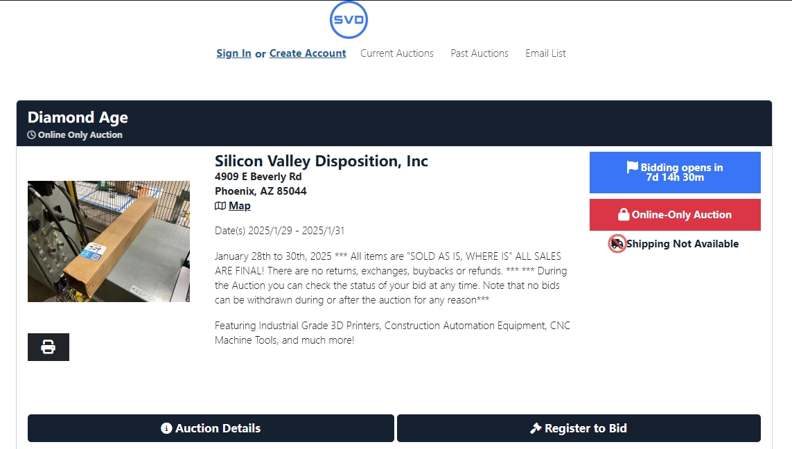 Disposition网站对它名下部分资产进行公开拍卖。此次拍卖活动包括了353件多样化的物品,从基础办公设备如椅子、桌子、空调和电视,到高端工业设备,包括文件柜、起重机、定制装配线、以及先进的Fanuc机械臂和AXYZ