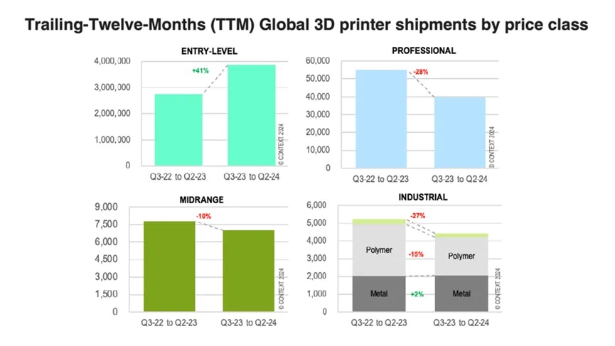 不过,也有一些希望的曙光闪现。根据CONTEXT的数据显示,专业级(2500美元至20000美元)价格区间的销售额仅略有下降(-1%),而入门级(低于2500美元)打印机的出货量则持续增长,同比增长达28%。在工业领域,尽管整体表现不佳,但部分供应商还是取得了亮眼的成绩。