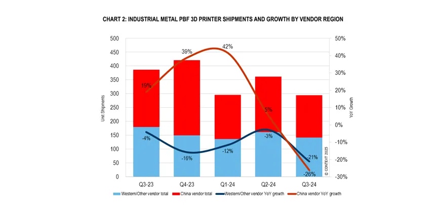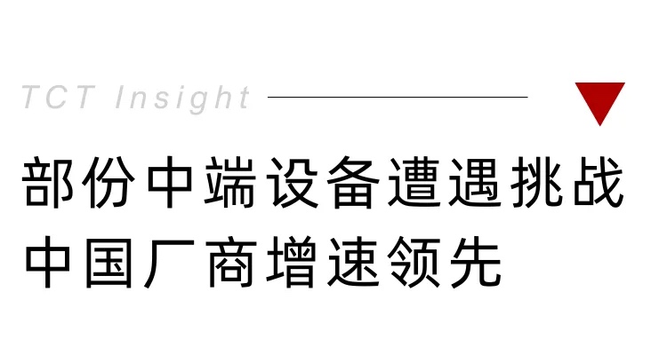 值得注意的是,由于中西方供应商的销售都出现下滑,尤其是在工业金属粉末床熔融(PBF)领域,使得显著的地区差异有所缩小。在工业金属PBF细分市场,中国供应商的总体出货量(主要面向国内市场)较上年同期下降了26%。