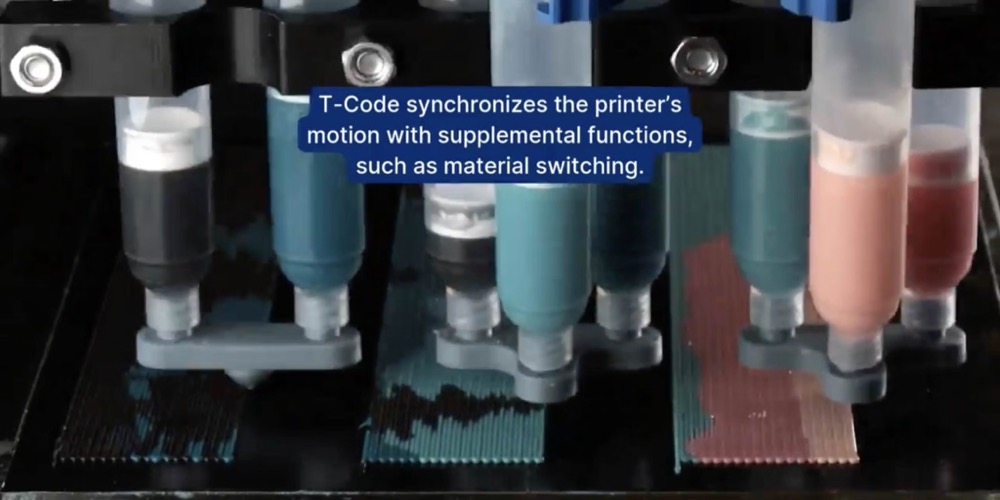 △T-Code将打印机的运动与补充功能同步,例如材料切换