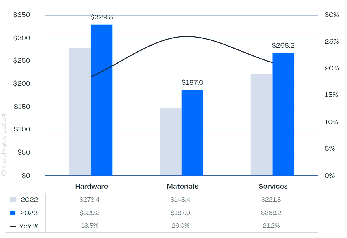 报告显示,2023 年复合材料增材制造市场增长 21.1%,达到 7.85 亿美元。硬件销售额同比增长 18.5%;材料增长最为显著,增幅达 26%,而服务同比增长 21.2%。