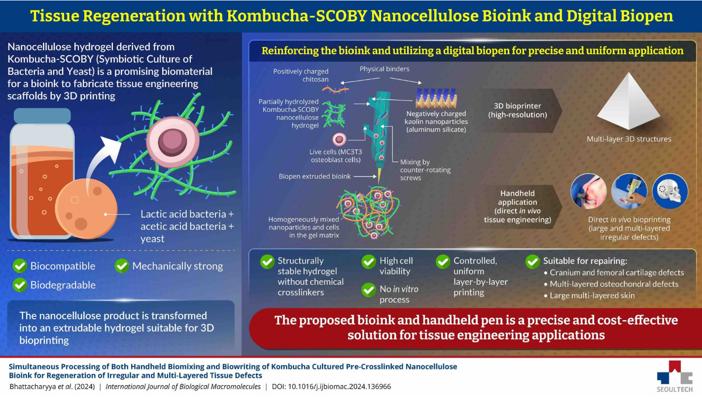 2025年2月5日,来自首尔国立科技大学 (SEOULTECH) 的研究人员声称开发了一种由康普茶菌衍生的纳米纤维素制成的新型生物墨水。这种生物墨水提供了一种支持细胞生长以修复组织的支架。它可以通过手持式生物笔直接应用于受损区域,使其成为直接体内组织工程伤口和复杂损伤的理想选择,特别是在紧急和急救环境中。