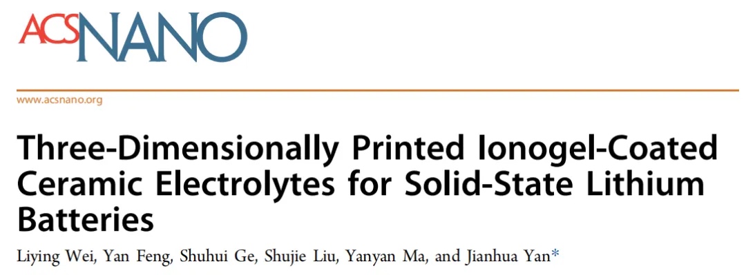 Batteries”,随着电力网络和电动汽车的快速发展,对高能量密度和高安全性的固态储能技术的需求日益迫切。3D打印技术因其能够实现结构定制化和快速成型,已成为制造固态电池的重要手段。然而,制备高陶瓷含量且低粘度的陶瓷基复合固体电解质(CSEs)浆料仍然是一个挑战,因为高陶瓷含量虽然有助于提高离子电导率和结构完整性,但会导致浆料粘度过高,影响打印性能。为了解决这一问题,本研究提出了一种离子凝胶涂层陶瓷的方法,通过在LLZO纳米颗粒表面涂覆离子液体(EmimTFSI),成功制备出适用于立体光刻(SLA)3D打印的高陶瓷含量浆料。利用这种浆料,研究团队打印出对称的蜂窝状砖块状电解质薄膜,并组装成固态锂离子电池。实验结果表明,这种电解质薄膜具有高离子电导率、低界面阻抗和优异的界面稳定性,能够在0.5