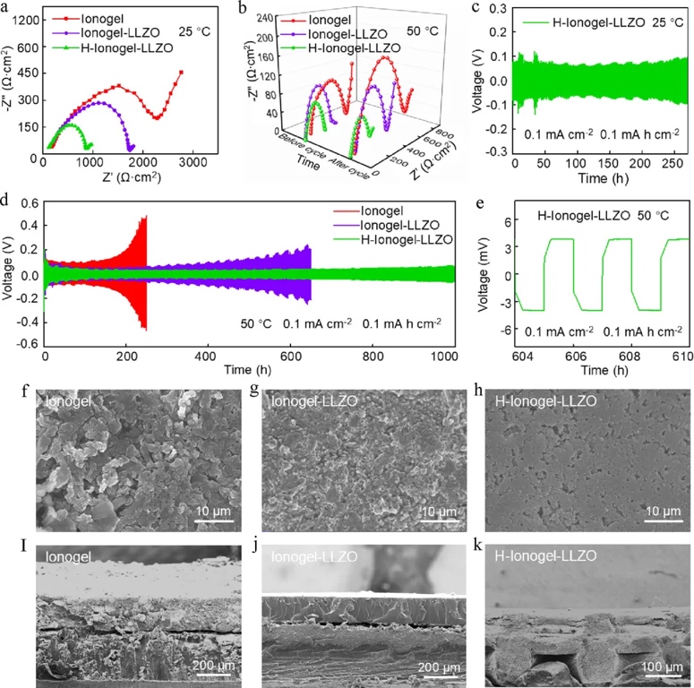 通过电化学阻抗谱(EIS)和对称电池测试,深入评估了H-ionogel-LLZO固态电解质在不同温度和循环条件下的界面稳定性。EIS测试表明,H-ionogel-LLZO电解质与锂金属之间的界面阻抗显著低于其他对照组,且在高温下进一步降低,显示出优异的界面兼容性。对称电池测试进一步证实了这一点,H-ionogel-LLZO电解质在50°C下能够稳定循环600小时,过电位仅为3.8