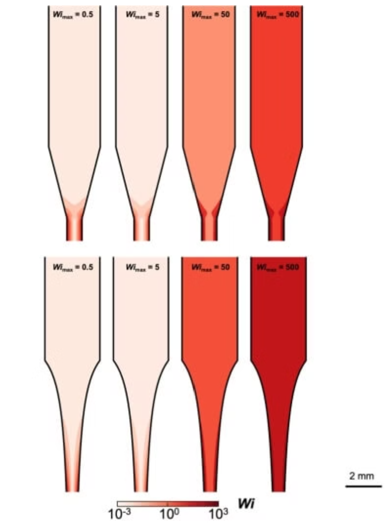 他们的计算和实验表明,喷嘴内的流动类型和速度分布决定了细丝类型。虽然有很多因素很重要,但研究人员表明,他们可以将其中大部分因素组合成一个参数,称为韦森伯格数,以描述不同的打印条件如何排列分子。