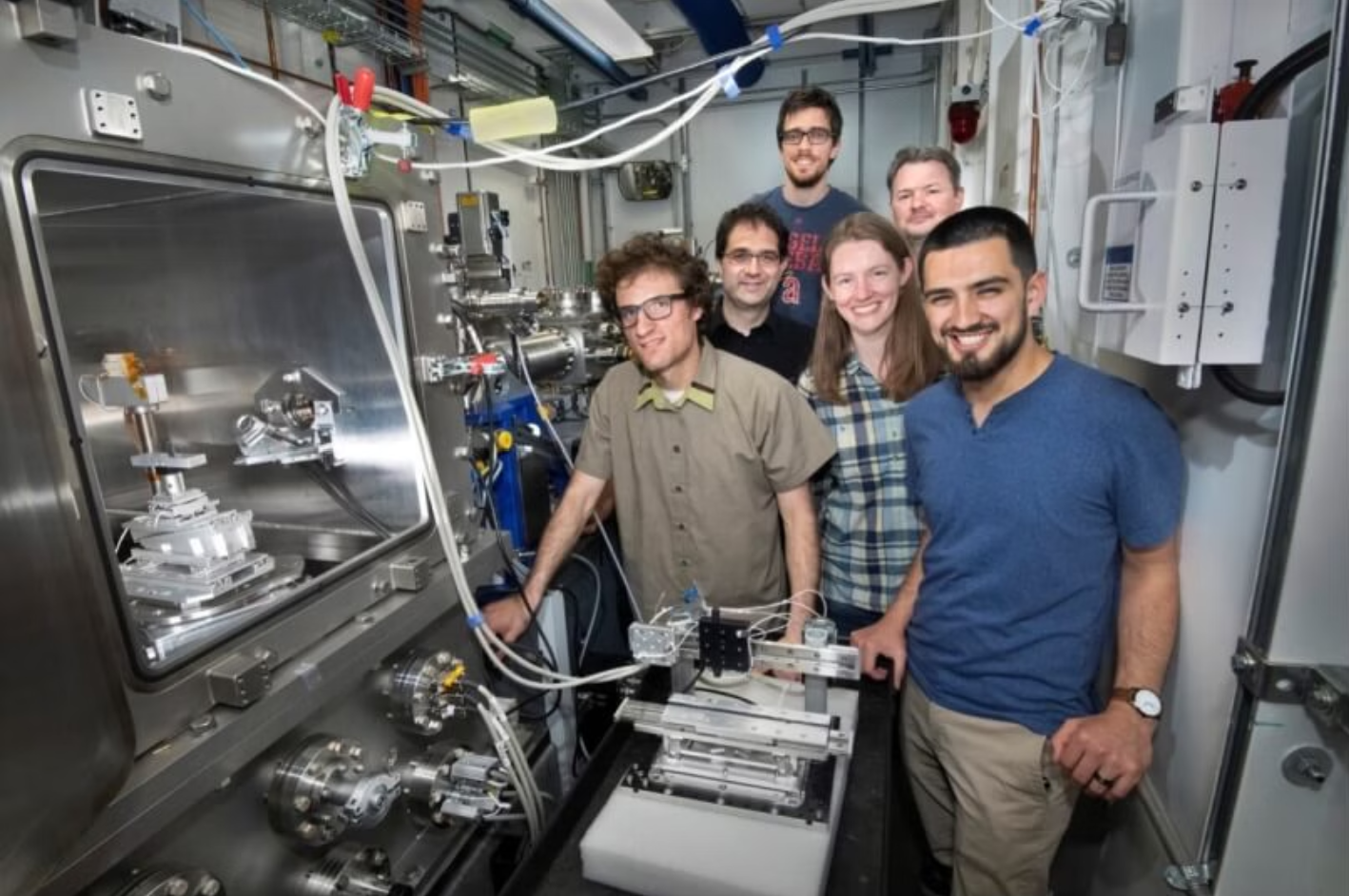 Davidson 和 Rodrigo Telles 与前任和现任布鲁克海文国家实验室研究人员一起在 X 射线仪器旁。从左至右:Benjamin