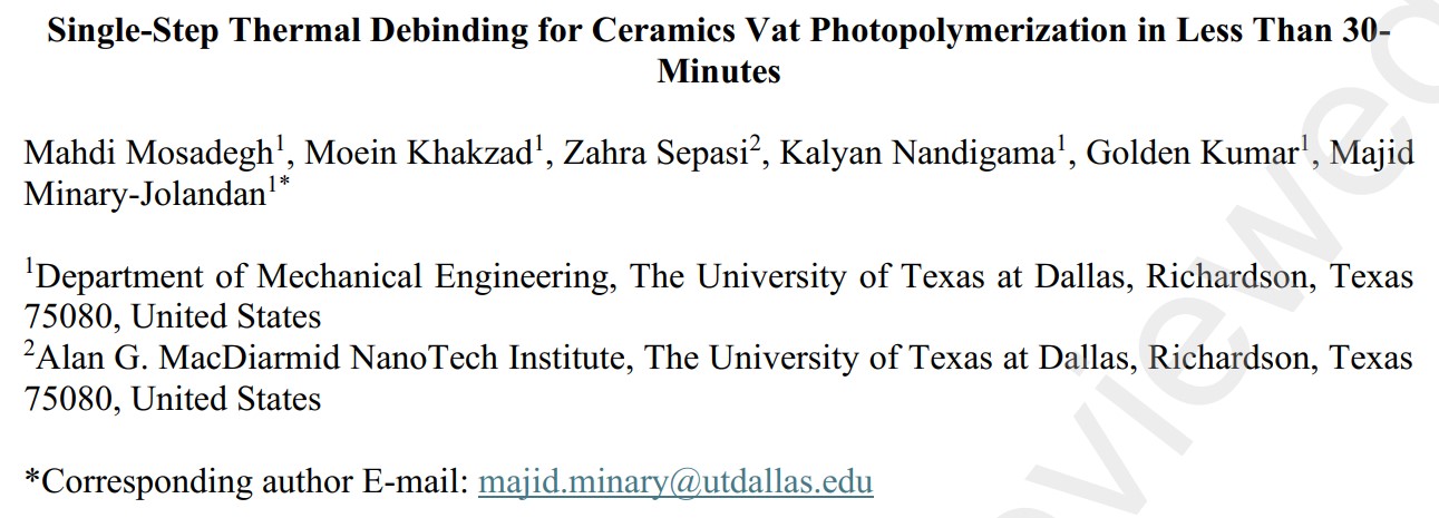 2025年2月8日,德克萨斯大学 (UT Dallas) 的研究人员开发了一种新型超快热脱脂 (UFTD) 技术,可以在 30 分钟内完全去除粘合剂。研究团队使用了3Y氧化锆浆料和Tethon 3D的陶瓷立体光刻 (大桶光聚合) 3D 打印机。