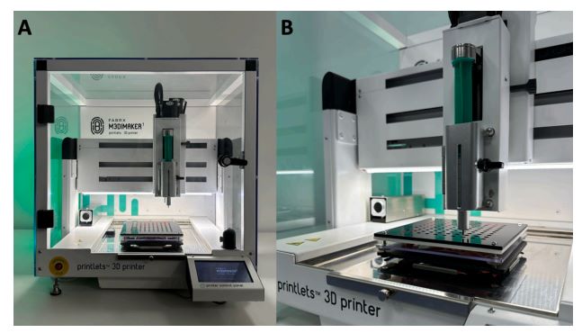 △M3DIMAKER 1 pharmaceutical 3D打印机(A)社区混合药房实验室的胶囊支架-药物3D打印机系统的全视图,(B)打印机内胶囊支架