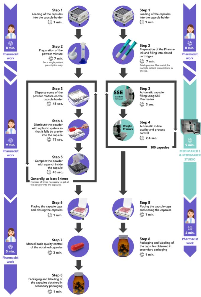 △工作流程对比,2.5 mg和5 mg米诺地尔胶囊生产中的时间分配。左边是传统的手工灌装,右边是3D打印机灌装。