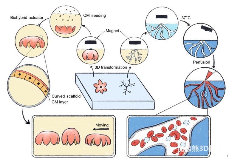 将其它可交联水凝胶与明胶结合使用,允许3D转化的水凝胶交联而不是牺牲。使用磁触发转化策略可以使水中的水凝胶从2D到转化为3D结构。通过紫外线或通过在水浴中添加交联剂来交联后,移除磁体后保持3D形态,从而产生独立的3D生物支架(图6A ),并实现仅由生物相容性水凝胶和细胞组成的3D步行致动器。这些进步有可能成为开发与生命系统交互的植入式工程组织和软机器人的使能平台。