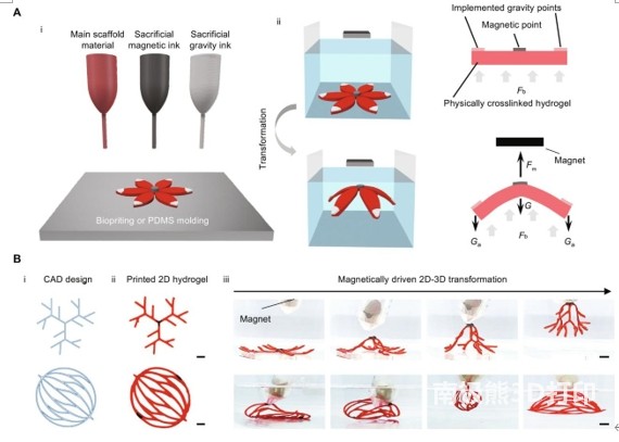 图2. 基于磁驱动变换的制造策略概念。(A) 示意图显示(i)材料沉积成扁平水凝胶前驱体,(ii)在磁体应用时浸没转化为3D形态。Fm表示施加在水凝胶上的磁力Fb表示浮力,G表示脚手架材料的重力,G一个表示额外实现的重力油墨的重力。(B)使用磁驱动变换策略对3D分支血管几何形状进行4D打印。几何设计在 AutoCAD(i)中生成,打印成扁平水凝胶前驱体(ii),然后使用磁铁(iii)转换为3D分支几何。