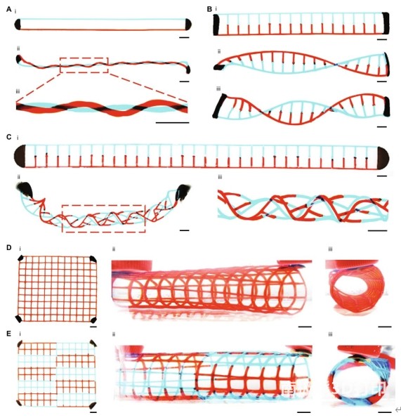 图 4. 使用多磁体对3D结构进行图案化。(A)在两个磁铁的帮助下,两股(i)之前和(ii和iii)被扭曲成双交织的螺旋线。(B)转化前(i)和转化后(ii和iii)的DNA样双螺旋结构。变形的3D双螺旋链,包含(ii)一个结和(iii)两个结。(C)将(i)细长的梯状扁平水凝胶前驱体扭曲成(ii和iii)编织管状结构。(D和E) 3D管状网片由(D)均质和(E)异质水凝胶网壁组成。(i)包含四个磁性墨点的扁平水凝胶前驱体。(II和III)3D管状网格的不同视图。