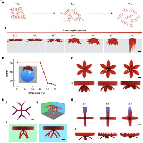 图3. 对磁驱动变换的多模态控制。(A) (i)显示明胶从凝胶状态到溶胶状态的热响应的方案。(ii)花形水凝胶前驱体在不同温度下的转变,直到它在33°C下熔化。(B)随着温度的升高,将花形水凝胶前驱体置于水中时的曲率半径(R)。在转换的水凝胶支架的图像下绘制一个蓝色圆圈来测量半径。(C)磁心对3D变换的影响。(i)磁中心面积增加的扁平水凝胶前驱体(白色虚线突出显示每个水凝胶前驱体的磁心边缘及其与中心和水凝胶前驱体边缘的距离)和(ii)前驱体的相应3D变换。(D)重力墨水对3D变换的影响。(i)具有两个带有重力墨水(白色尖端)的分支和两个没有的分支的扁平水凝胶前体。(ii)从两个不同角度观察时具有不同弯曲程度的转化前驱体的示意图和(iii)实验图像。(E)二维前驱体结构设计的影响。(i)具有不同边缘与中心分支宽度比(2:1、1:1和2:3) 的扁平水凝胶前驱体和相应的3D转换;(ii)前驱体的相应3D变换。