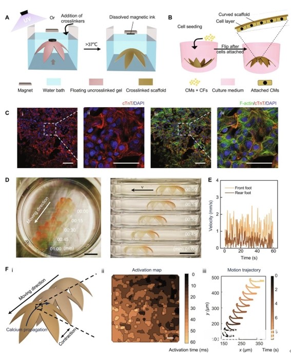 图 6. 3D薄生物支架的磁驱动转化能够产生具有行走运动的基于水凝胶的生物混合致动器。(A)方案说明了创建花形的基于3D薄膜的生物支架的过程。最初,扁平的可交联水凝胶前驱体转化为3D形态,然后在其上方放置磁铁时交联。在37°C下孵育后,交联支架将从磁体中释放出来,而明胶会溶解,同时从支架中释放磁性墨水。(B)说明生物支架上的细胞接种和层形成的方案。(C)在3D薄生物支架表面培养的心肌细胞的免疫染色。cTnT(红色)、DAPI(蓝色)和F-肌动蛋白(绿色)。(I和III)低放大倍率。比例尺,50 μm。(II和IV)高放大倍率。比例尺,25μm。(D) (i)行走生物杂交致动器的俯视图和(ii)侧视图延时照片(收集 1 分钟)。比例尺,1厘米。(E)前脚和后脚随时间变化的瞬时速度。(F) (i)支架收缩、移动和钙传播方向示意图;(ii) 支架中心心肌细胞随时间的钙传播映射(比例尺:500 μm);(iii)脚手架运动分析。