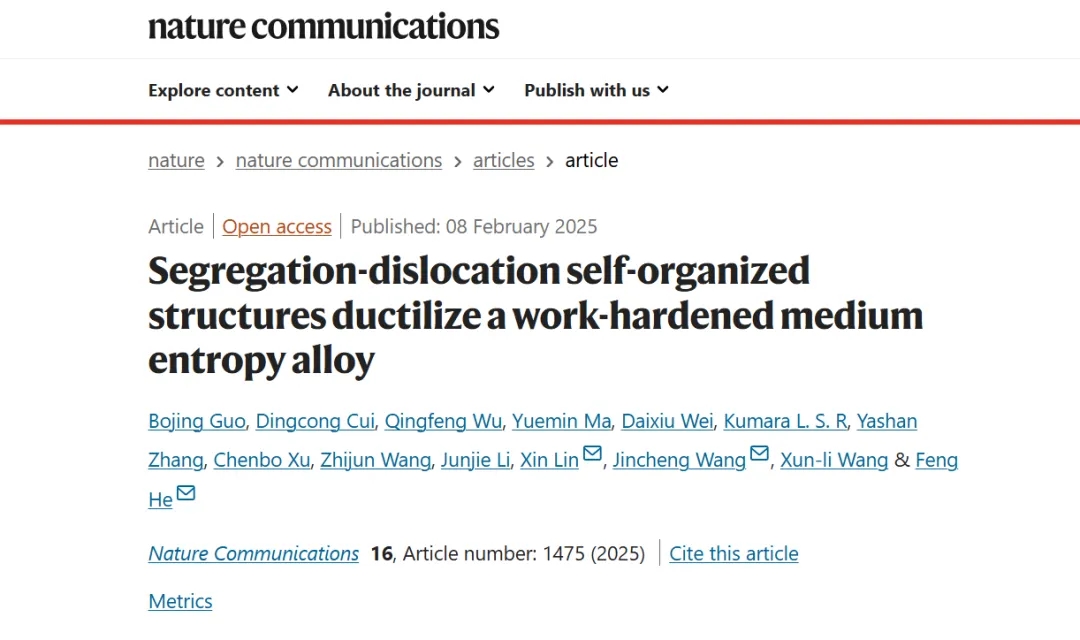 work-hardened medium entropy alloy”为题,发表于国际著名期刊《自然·通讯》(Nature