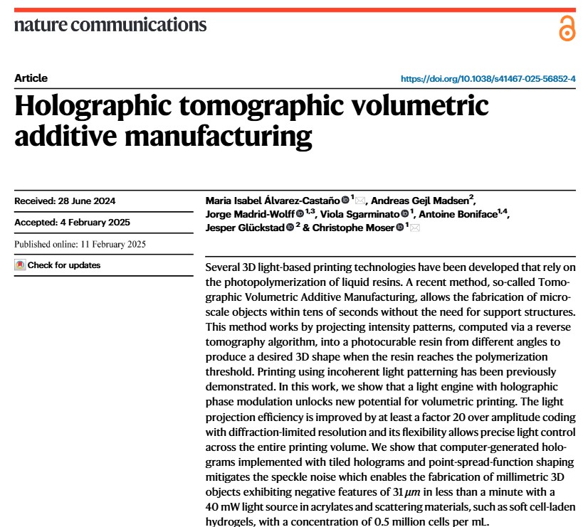 2025年2月15日,由 Christophe Moser 教授领导的 EPFL 应用光子器件实验室和由 Jesper Glückstad 教授领导的 SDU 光子工程中心的研究人员推出一种新的体积增材制造方法—HoloTile,凭借新技术能够高效率制造高保真的 3D 打印物体。相关研究以题为“Holographic tomographicvolumetricadditive manufacturing”的论文发表在《自然通讯》杂志上。