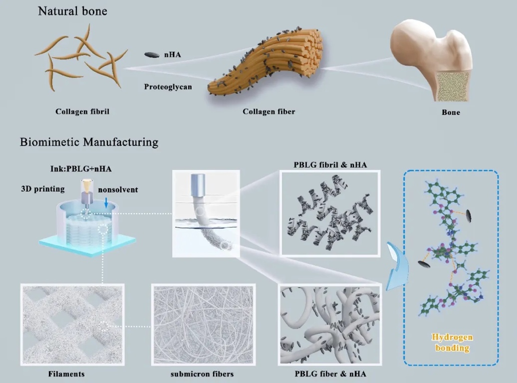 上海大学尹静波、张坤玺教授联合复旦大学附属闵行区中心医院、同济大学附属同济医院基于聚(L-谷氨酸苄酯)(PBLG)在成螺溶剂中的自组装特性,提出一种非溶剂辅助3D打印方法,在实现PBLG基复合材料3D打印的同时一步法生成仿生纤维结构,以模拟天然骨组织中胶原纤维束的形成。研究成果发表在《Advanced