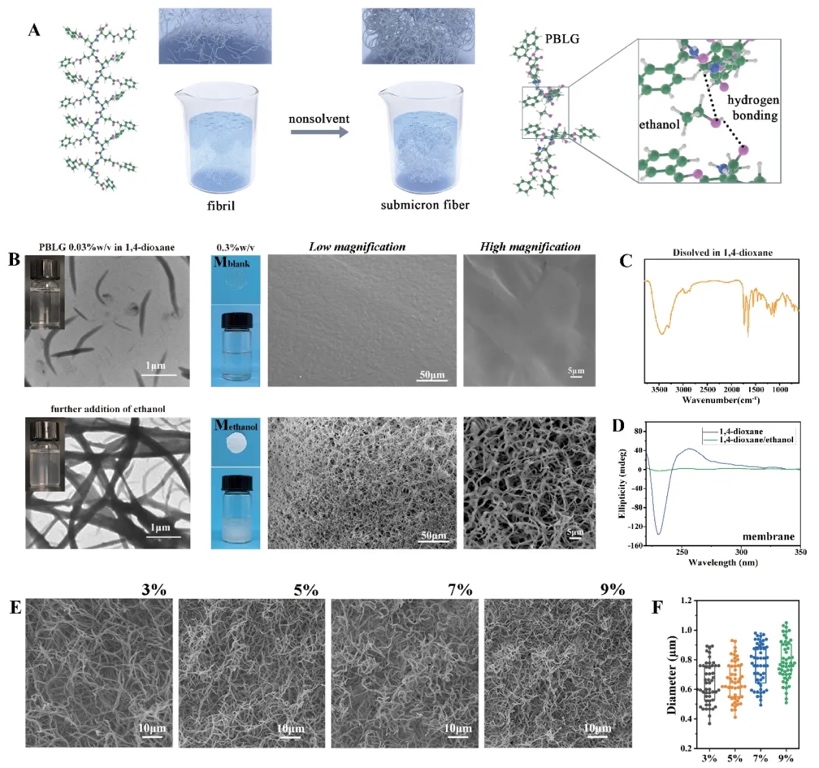 研究首先说明PBLG在有机成螺溶剂中可自组装形成纳米原纤维,然而有机溶剂去除后无法保持纳米纤维结构。非溶剂乙醇引入后,原纤维会进一步生长成为尺寸更大的亚微米级纤维,且溶剂去除后可保持纤维结构。研究同时揭示醇羟基介导的分子间氢键相互作用是PBLG原纤维生长成亚微米纤维的重要影响因素。这一纳米纤维向亚微米纤维的转变可实现对“组织中胶原原纤维经少量黏合质黏结成胶原纤维这一特征”的模拟。
