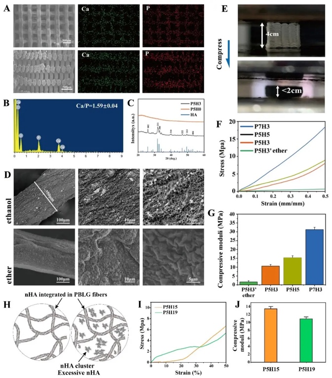进一步,研究证实了即使是高浓度PBLG,非溶剂也可以诱导纤维结构形成,这为3D打印提供了可行性,因为往往挤出打印需要墨水浓度较高。在此基础上,将PBLG溶液与纳米羟基磷灰石nHA复合制备打印墨水。然而无论是PBLG溶液还是复合nHA的PBLG溶液都不具备可打印性。但是如果将乙醇作为接收相,即在乙醇中挤出,PBLG/nHA复合体系则具有优异的可打印性,并揭示nHA与PBLG之间的氢键相互作用促使溶于1,4-二氧六环中的PBLG和nHA混合物表现出优异的可挤出性、自支撑性和可塑性。同时为了兼顾可打印性和纤维结构的生成,研究对墨水组分进行了优化,实现墨水打印的同时同步生成仿生纤维结构。值得一提的是,纤维生成过程中,nHA与PBLG通过相互作用结合,不仅是对基质组成的仿生,也赋予打印材料优异的力学特性(36.59