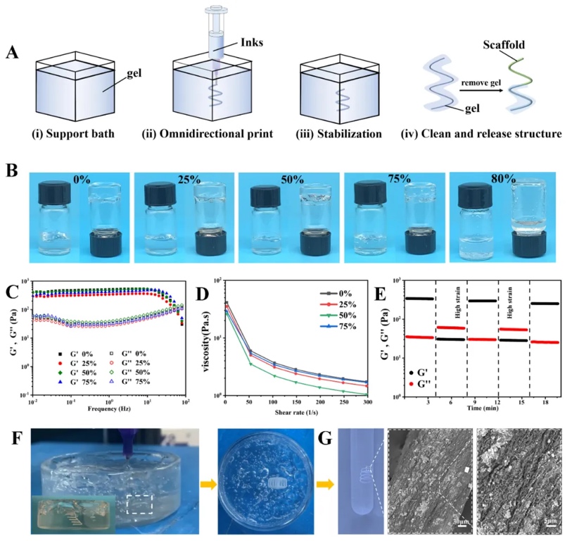 最后,研究为进一步克服层层堆叠打印因重力导致的塌陷缺点以及打印性能与仿生纤维制备的矛盾,制备了乙醇凝胶作为支撑浴,实现全相打印,扩大打印窗口。纤维结构引起的细胞迁移效应和优异的力学支撑性使其可能成为潜在的骨替代物。该研究提出的新型非溶剂辅助3D打印制造策略,突破了针对稀溶液自组装成纤维的局限性,实现了PBLG基材料的3D打印和仿生纤维结构构筑,展现出仿生材料大规模制造的巨大潜力。