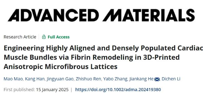 相关研究成果以“Engineering Highly Aligned and Densely Populated Cardiac Muscle Bundles via Fibrin Remodeling in 3D-PrintedAnisotropic Microfibrous Lattices”为题发表在国际学术期刊《Advanced Materials》上。西安交通大学贺健康教授为论文的通讯作者,西安交通大学毛茅研究员与韩康博士生为论文共同第一作者。该工作得到了国家自然科学基金(52125501,52205317)支持。