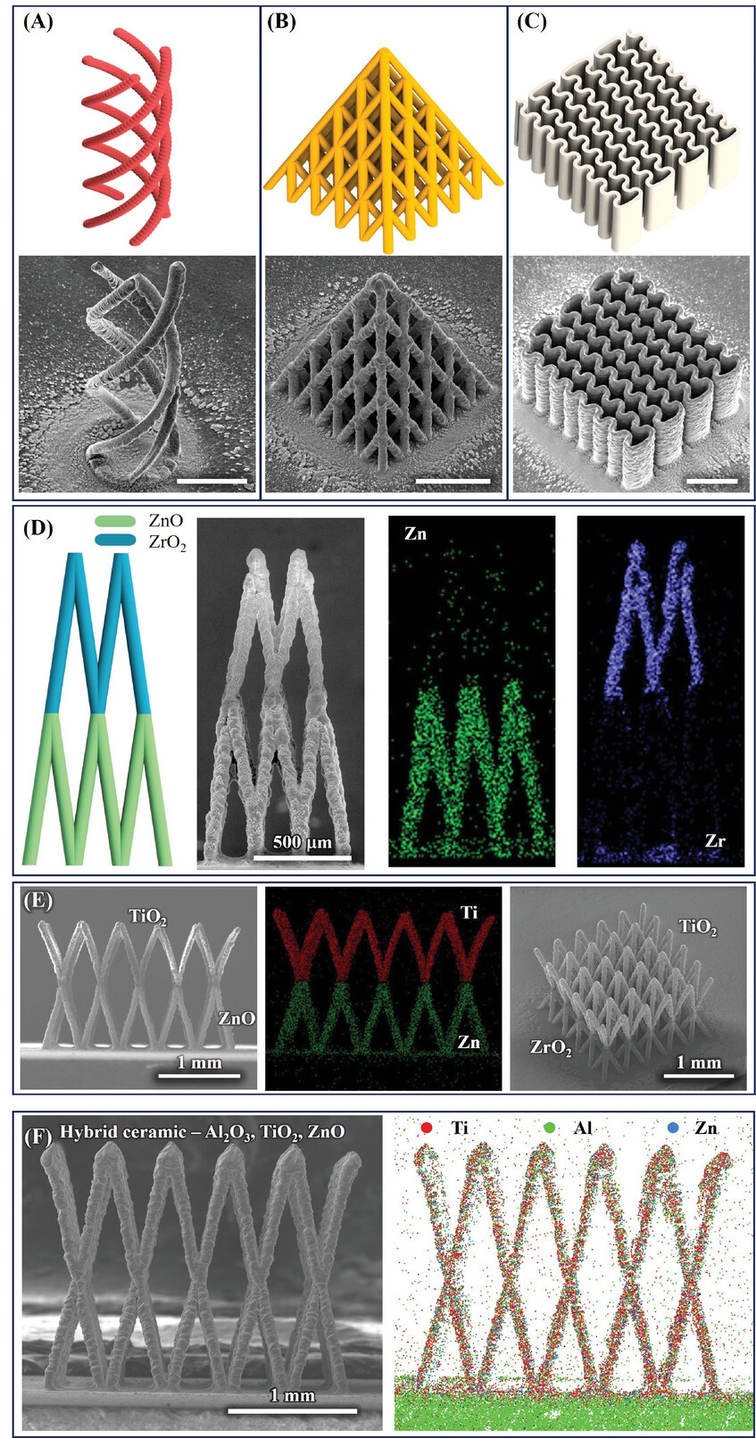 3D打印机中进行打印,无需辅助支撑结构,从而简化了制造过程。此外,3D-AJP技术还展示了它在制造双材料3D结构和混合陶瓷方面的多功能性,包括氧化锌/氧化锆、氧化锌/二氧化钛、二氧化钛/氧化锆等。