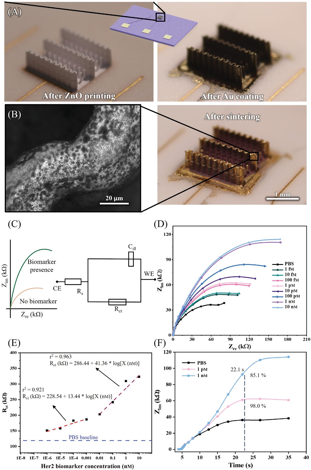 研究团队展示了3D-AJP技术在两个关键领域的应用潜力。在环保方面,3D打印的陶瓷光催化剂在水净化过程中的光催化效率比传统块状陶瓷提高了400%。在医疗领域,研究团队开发了一种用于乳腺癌检测的高灵敏度Her2生物标志物传感器,该传感器实现了22秒的快速响应时间,并创下了0.0193飞摩尔(fM)的超低检测限纪录。